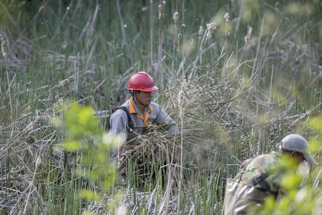这个时候,正好是柳絮飞的时候,有一点飘雪的感觉。淹城中间种荷花和芦苇的地方,水都被抽干了,中间还有几个工作人员收割芦苇。