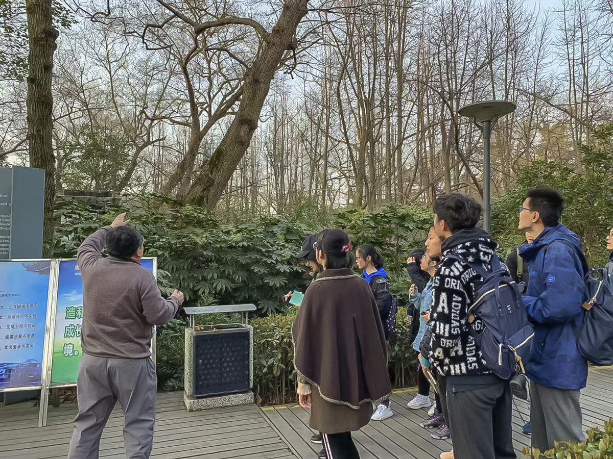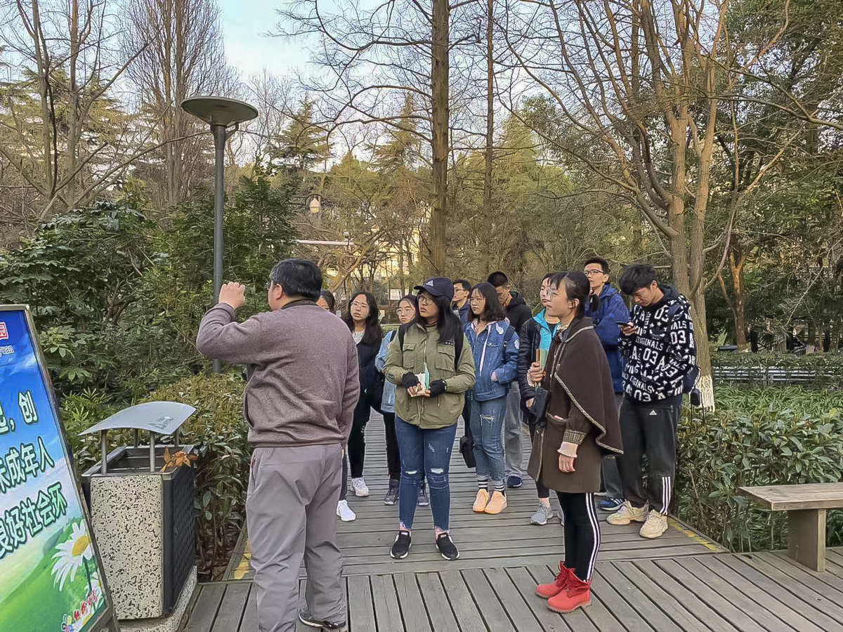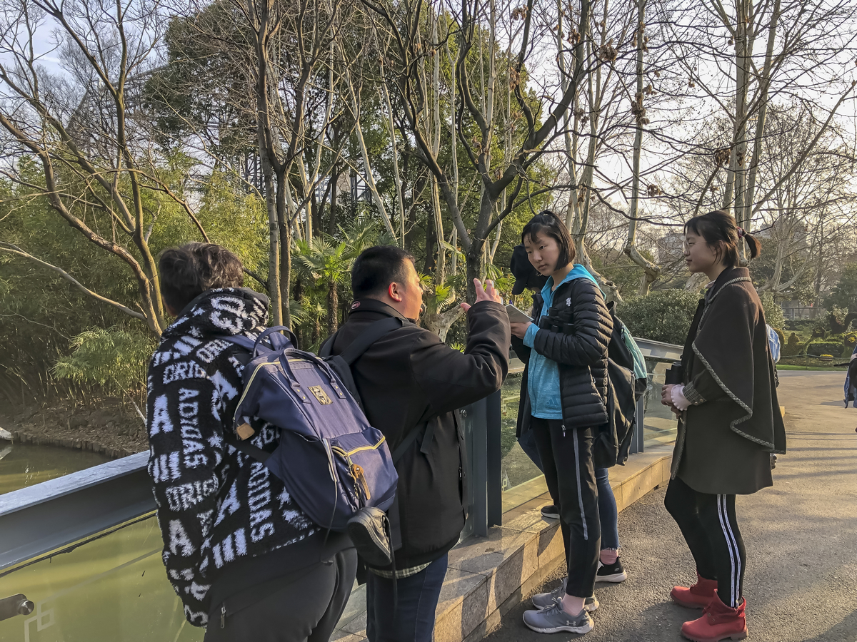 大家先分了两组,一组同学和我,另一组的同学和赵博士,就鸟类的辩别,野鸟的生活习性,城市化对地区常见鸟类活动的影响,城区生态环境等问题进行了讲解。快到8点时,两组同学进行对调。